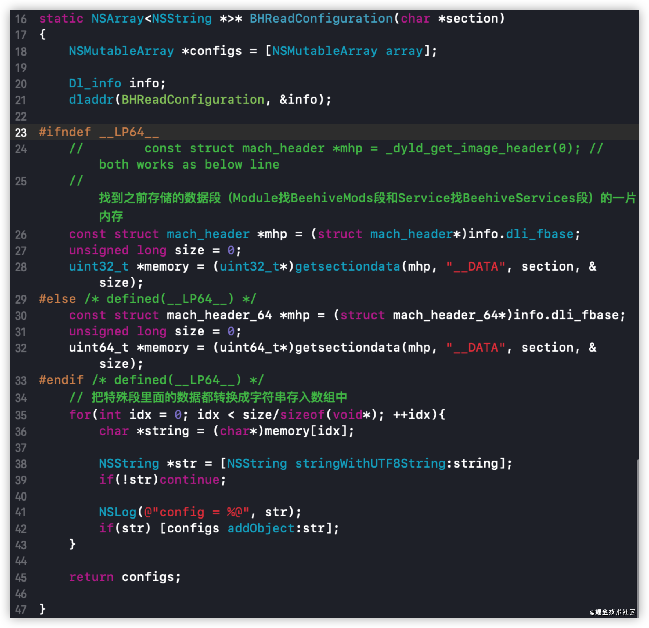 进入BHReadConfiguration方法,主要是通过Mach-O找到存储的数据段,取出放入数组中