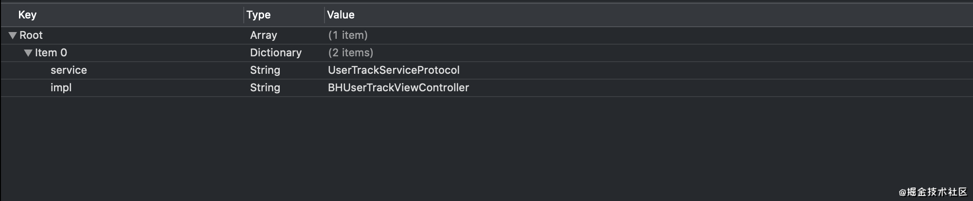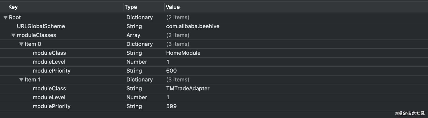plist文件,plist文件的格式也是数组中包含多个字典。字典里面有两个key,一个是"moduleLevel",另一个是"moduleClass"。注意根的数组的名字叫"moduleClasses"。