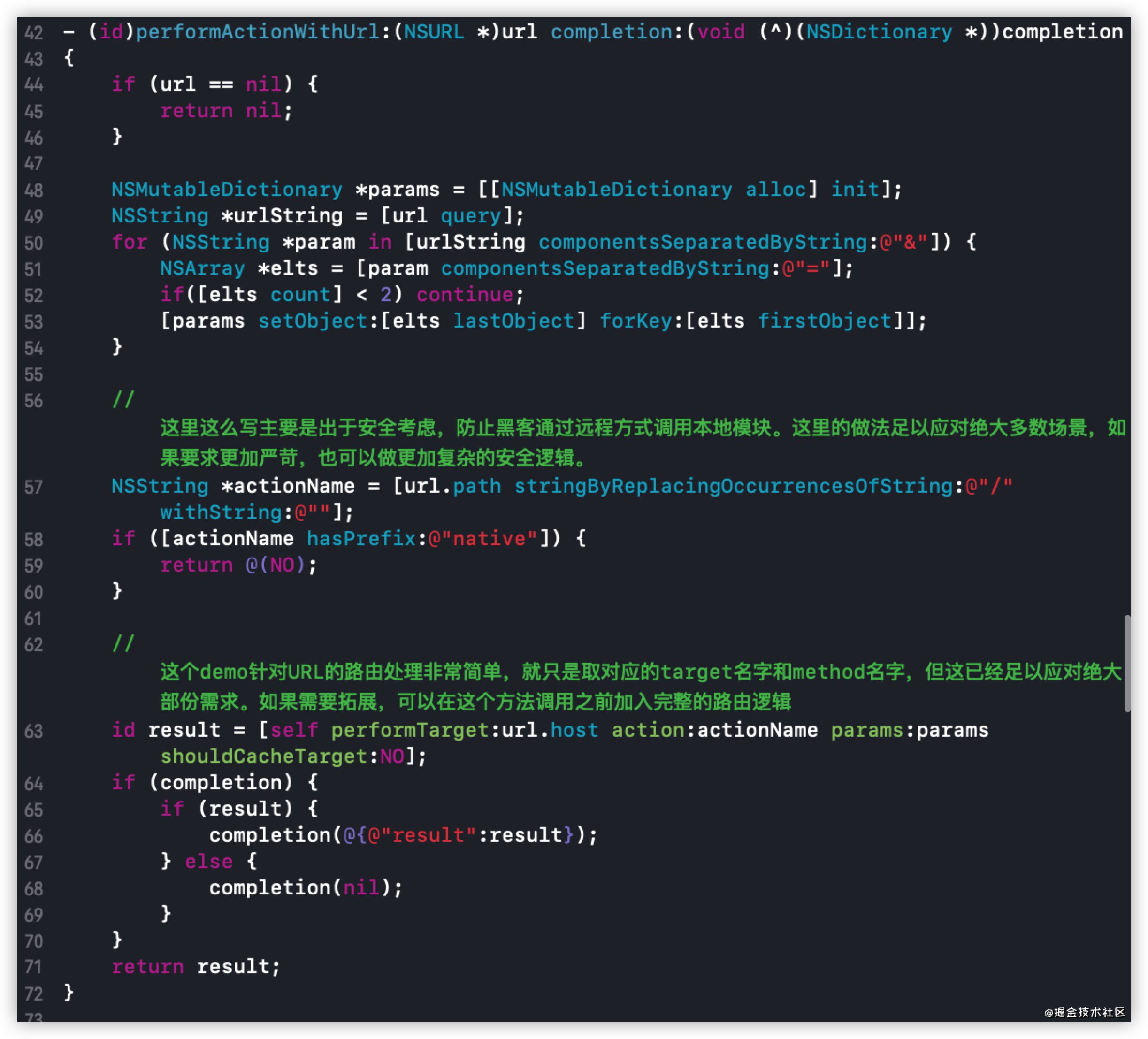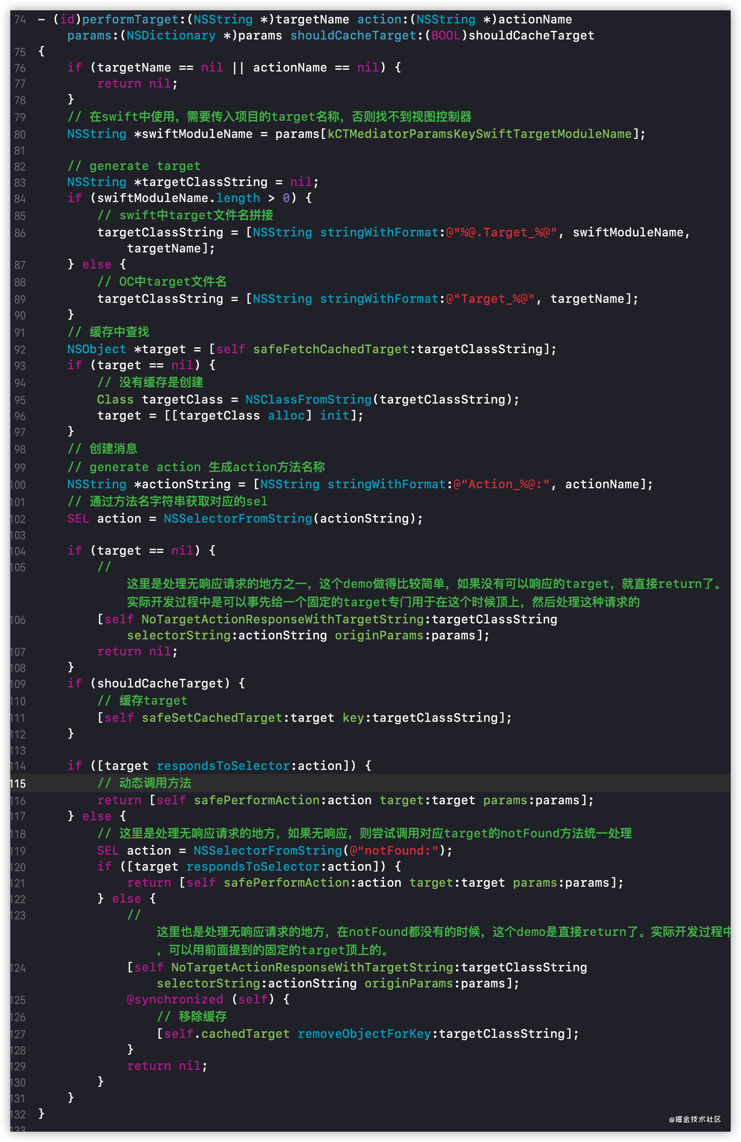 performTarget:action:params:shouldCacheTarget:方法主要是对targetName和actionName进行容错处理,也就是对调用方法无响应的处理。- 这个方法封装了