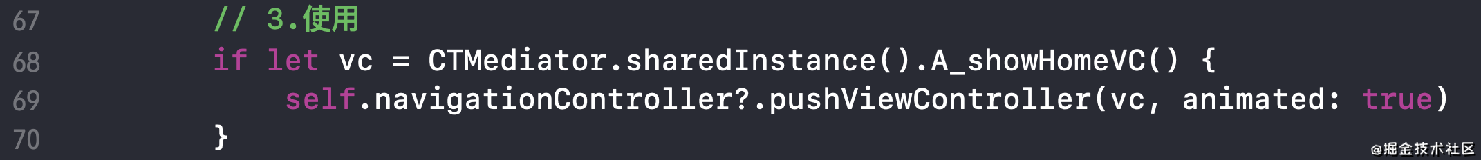 满足Target_ 前缀的类的对象和Action_的方法才能被CTMediator使用。这时,我们可以看出中间者架构的优势,也就是利于统一管理,可以轻松管控制定的规则。