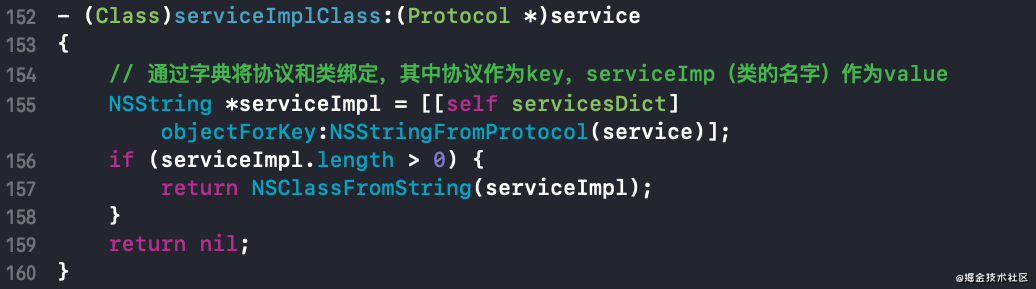 serviceImplClass实现,从这里可以看出protocol和类是通过字典绑定的,protocol作为key,serviceImp(类的名字)作为value
