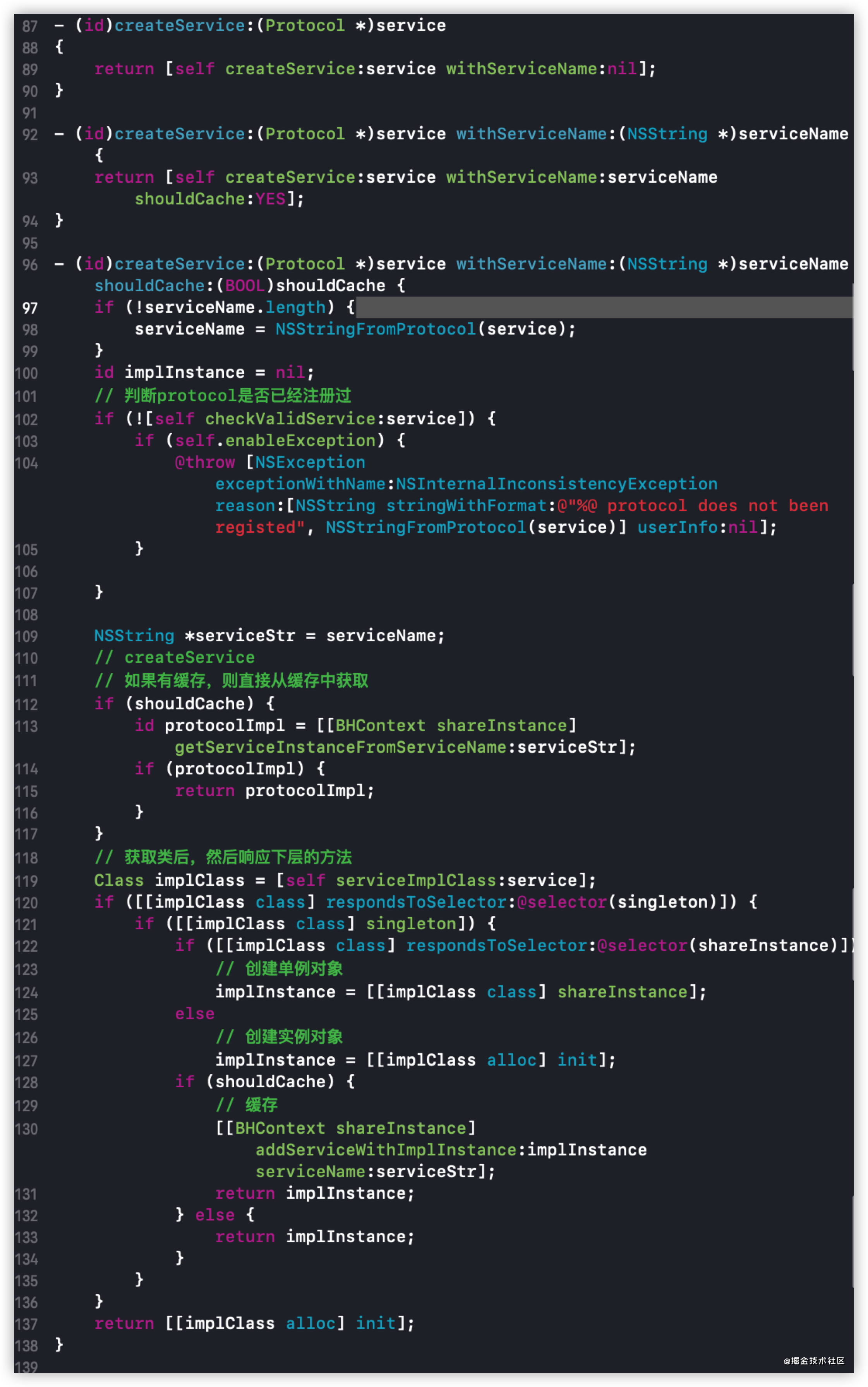 createService会先检查Protocol协议是否是注册过的。然后接着取出字典里面对应的Class,如果实现了shareInstance方法,那么就创建一个单例对象,如果没有,那么就创建一个实例对象。如果还实现了singleton,就能进一步的把implInstance和serviceStr对应的加到BHContext的servicesByName字典里面缓存起来。这样就可以随着上下文传递了