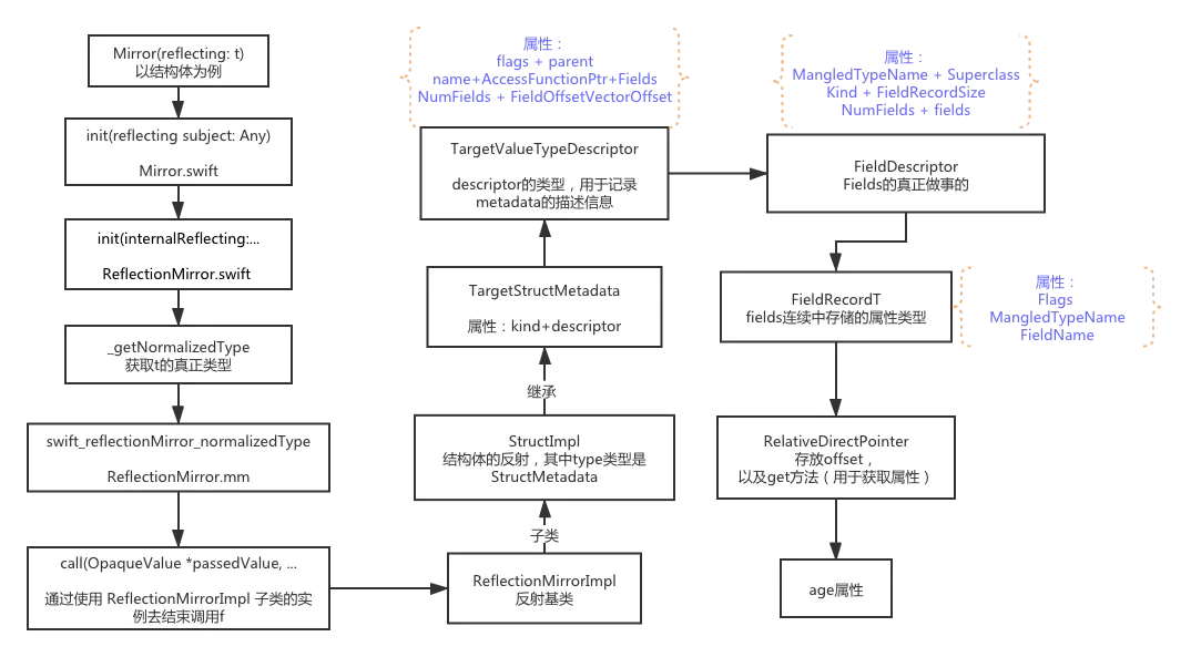 Swift 的反射机制是基于一个叫 Mirror 的 struct 来实现的。即为具体的 subject 创建一个 Mirror,然后就可以通过它查询这个对象subject。简单理解就是 Mirror通过meatadata,在其内部创建了一个结构,用于输出metadata中的descriptor