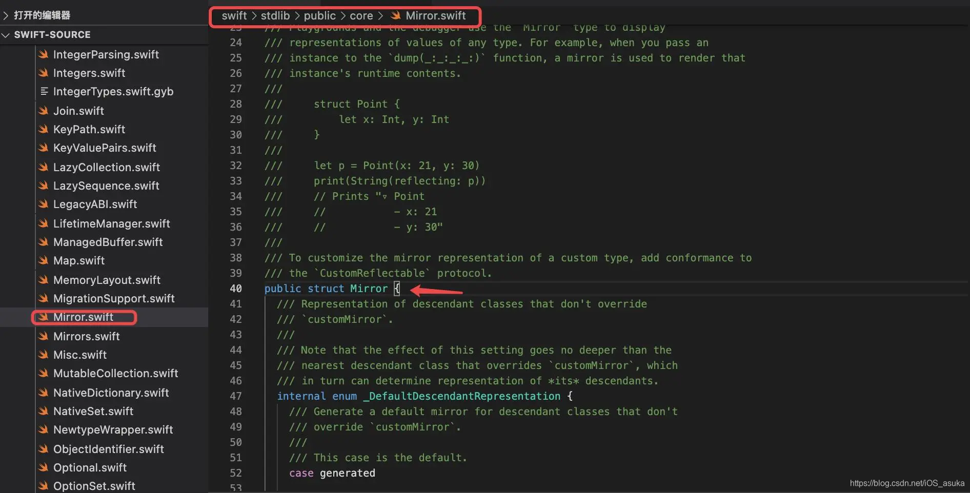 Mirror.swift文件中,路径为swift->stdlib->public->core->Mirror.swift