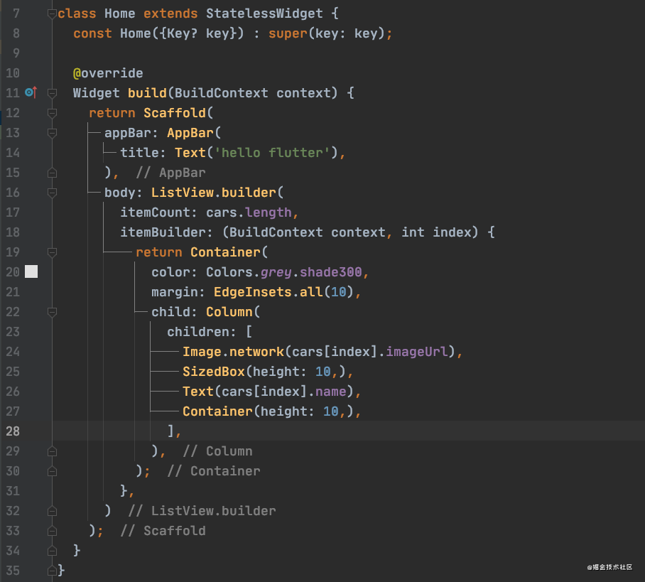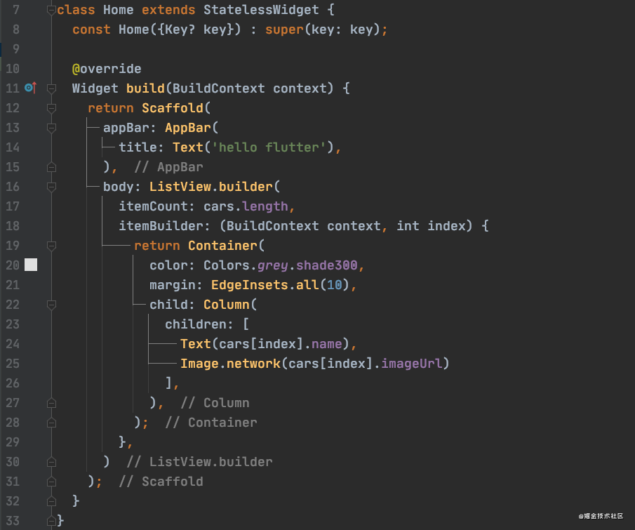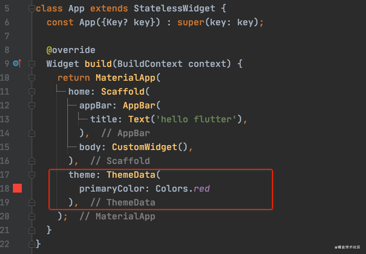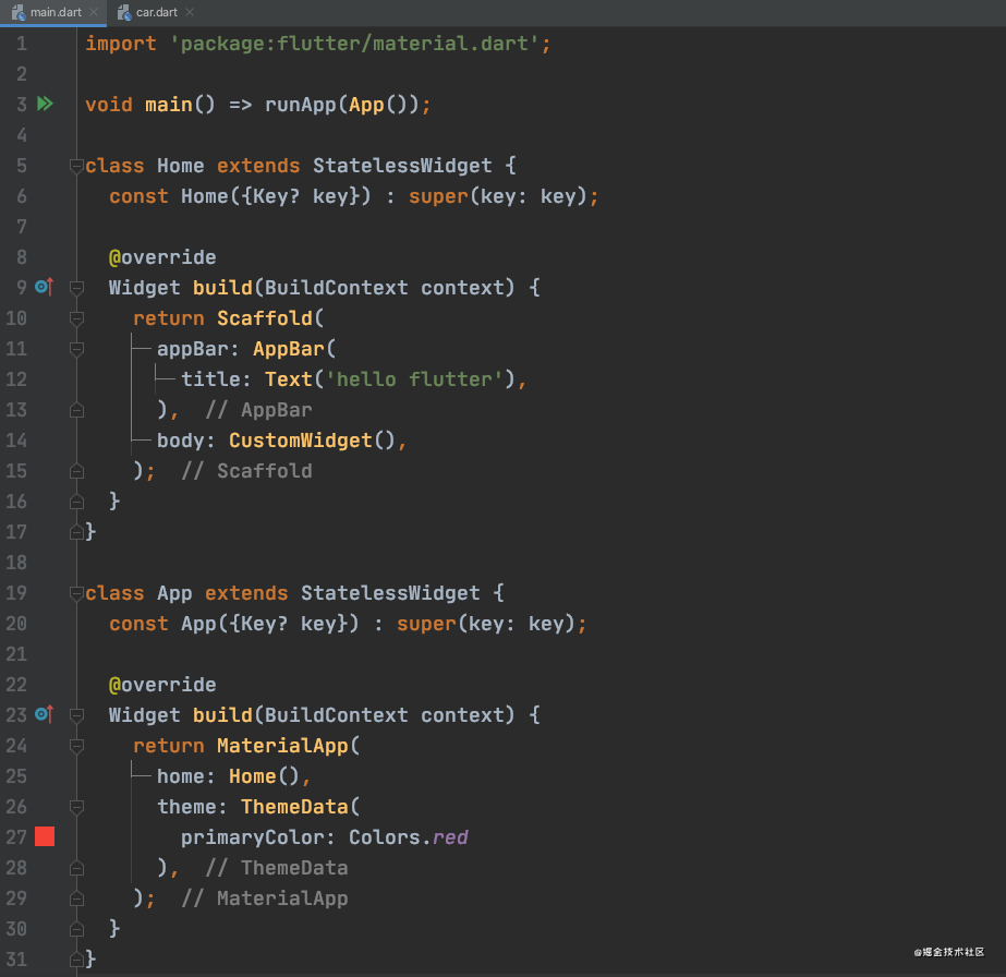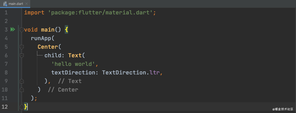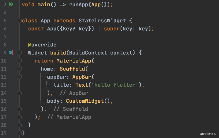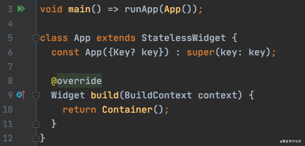 有些时候,我们发现hot reload无法更新界面,可以使用hot restart,如果hot restart还是无法更新界面,那就需要重新运行一下就可以了。此时我们发现main()函数里面就只有一句调用runApp()代码,在Dart语言中,函数定义如果只有一句代码,那么可以省略成如下箭头形式