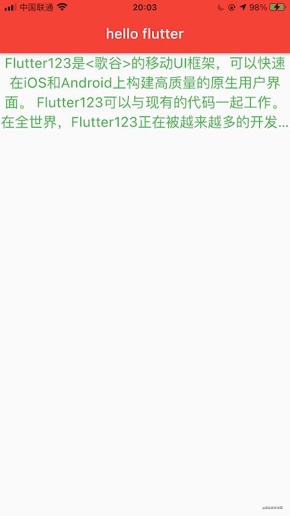 没错就像我们iOS的APP同样需要一个rootViewController一样,MaterialApp函数需要一个home参数,home参数可以传一个Widget类,如果传入我们刚刚写的CustomWidget类,运行后发现有了一点不一样的地方