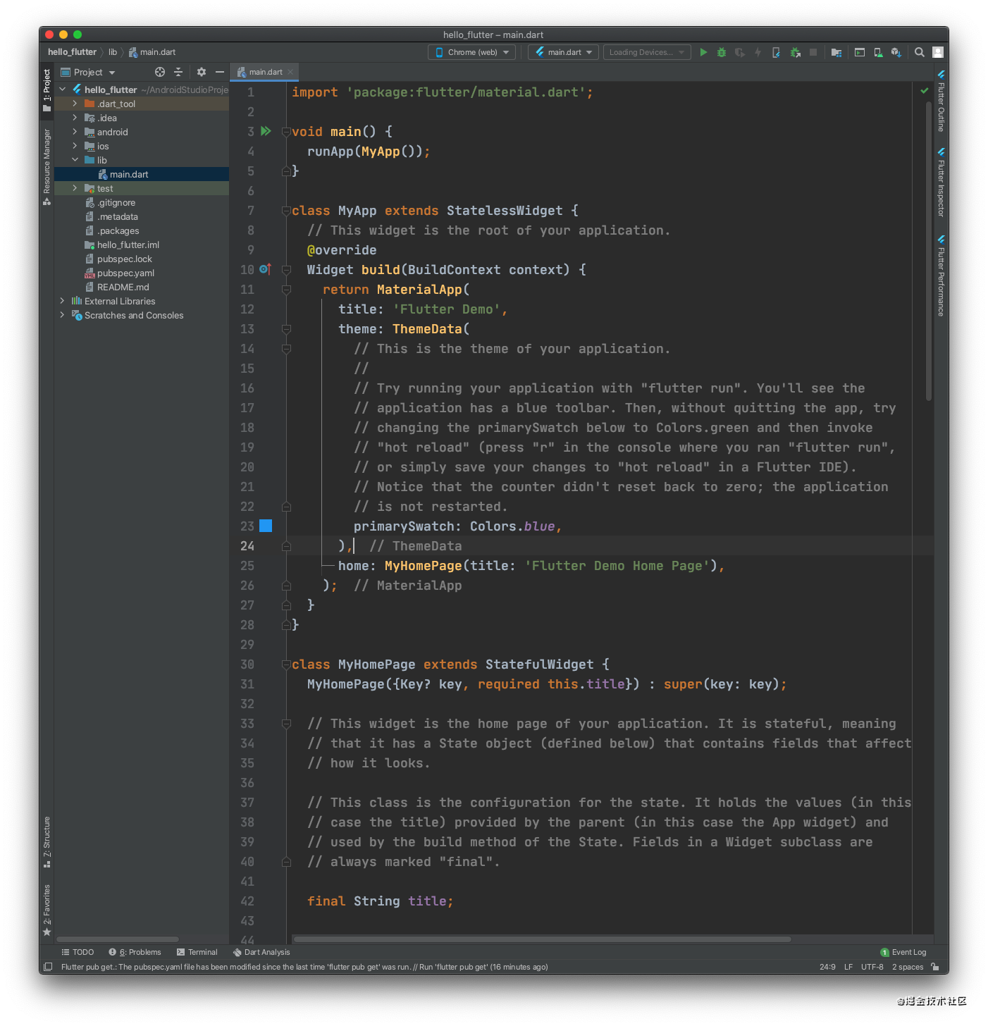 点击Finish之后就可以看到完整的工程目录了,flutter工程的主入口,跟我们iOS项目一样有一个main.m文件,flutter的是main.dart文件,可以看到这个文件里面已经有不少初始的代码了,今天是我们第一次接触flutter项目,就不要这里的代码,全部删掉,我们从第一行代码开始自己敲出来