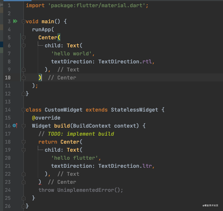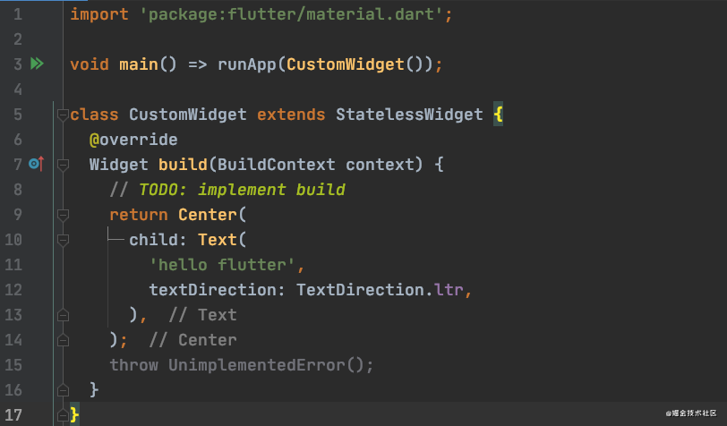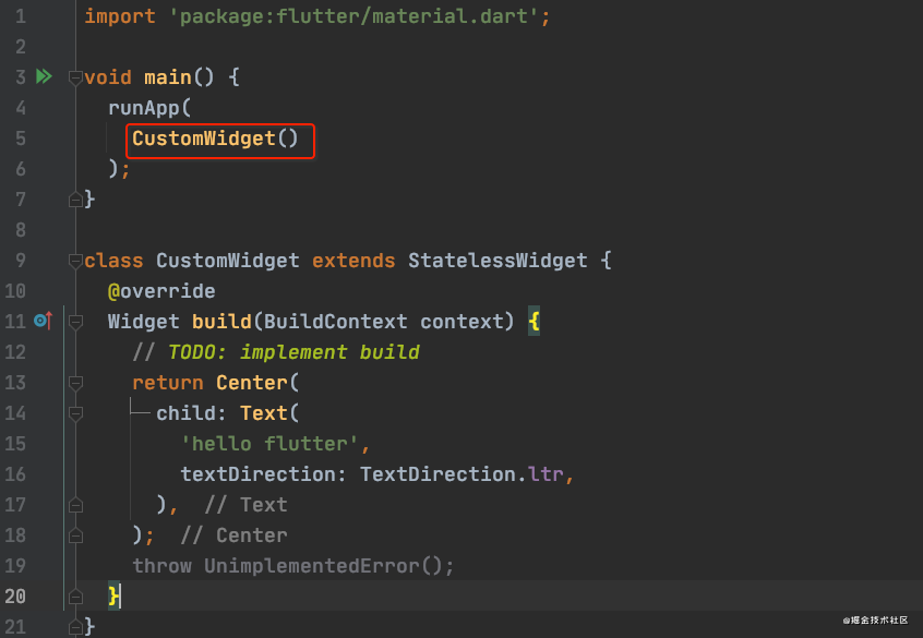 这个时候,如何将我们的hello flutter显示到屏幕呢,可以看到runApp函数里面有一个Center类,我们CustomWidget类的build方法也是返回的一个Center类,所以可以直接将我们CustomWidget初始化给runApp作参数