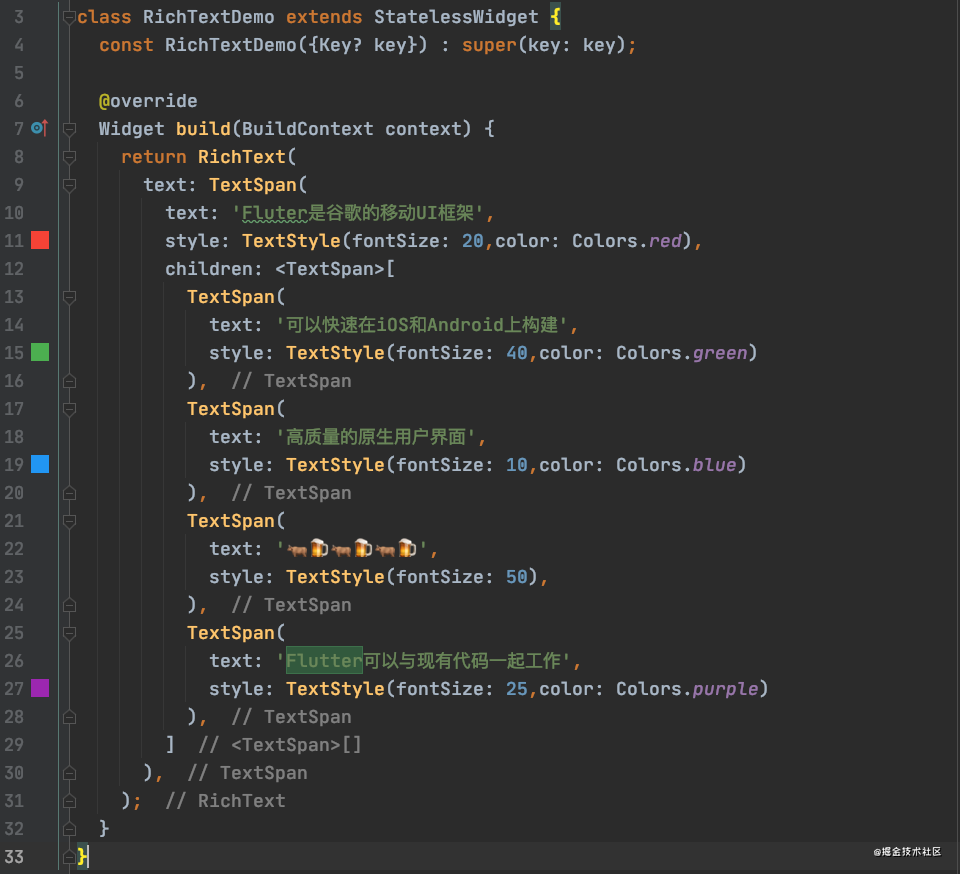 RichText就是富文本,它的text属性可以传一个TextSpan的类,这个TextSpan类可以设置text文本,设置style样式,还可以设置children子控件,这样就可以无限加花样拼接各种字符串在一起,代码如下