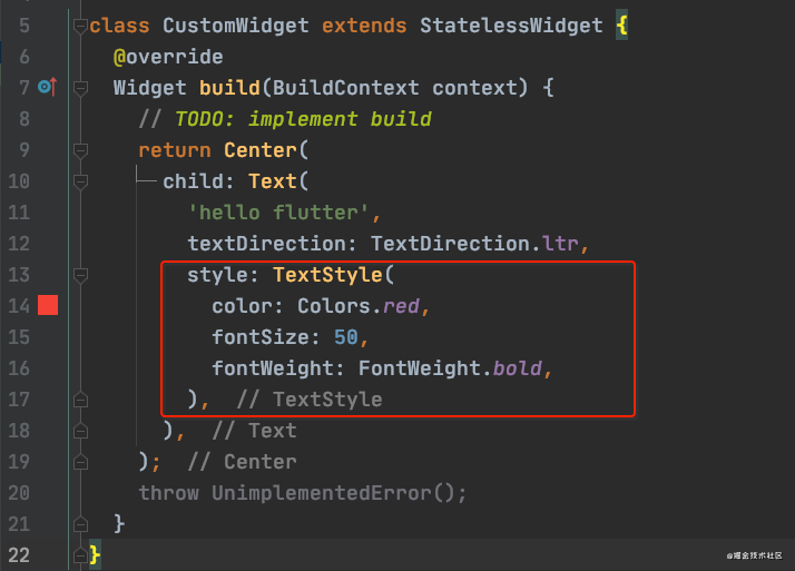 这里的final表示不可变,常量的意思,类似于Swift里面的let。可以看到style是一个TextStyle类型,查看TextStyle类,会发现里面很多的属性,比如color,backgroundColor,fontSize,fontWeight…这些都是很熟悉的属性,接下来我们设置一下hello flutter的一些文字样式