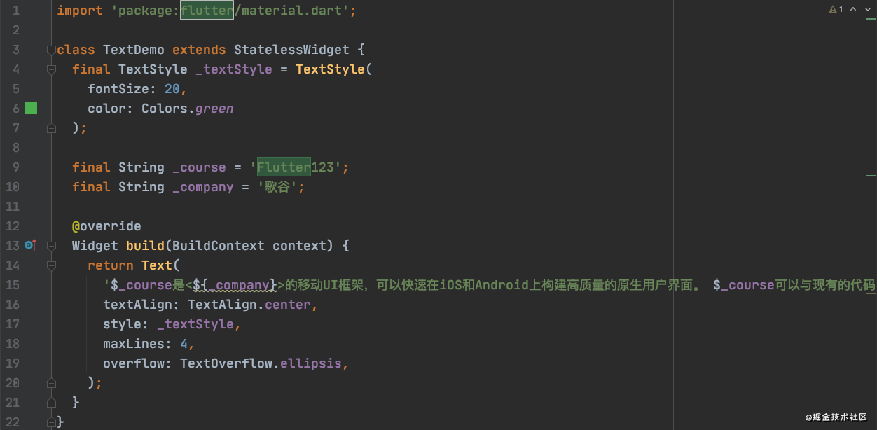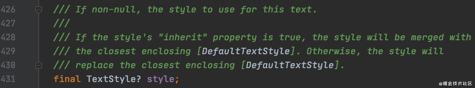 按住command再用鼠标左键点击Text类,就会跳到一个text.dart文件,会看到一个this.style属性,再次按住command点击,会来到style的声明部分: