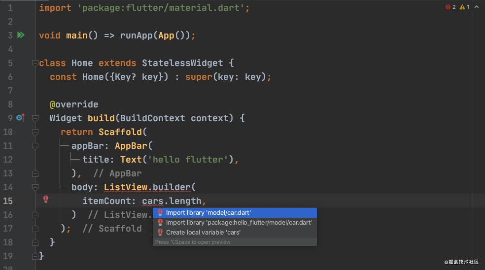 这里说一个Android Studio的比Xcode好用的地方,如图的itemCount使用了cars.length但是提示cars报错,是因为没有导入car.dart文件,给了个小红灯泡。这个时候,我们光标移动到Car类上,然后使用option + 回车会弹出一个菜单,再按一次回车就可以导入我们的car.dart文件了
