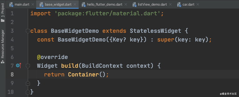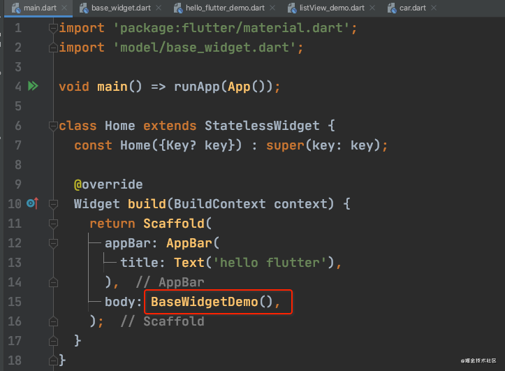 可以在main.dart文件中直接使用我的BaseWidgetDemo初始化方法,这样我们就不需要再去main.dart文件修改代码了。每介绍一个新Widget直接修改BaseWidgetDemo的build方法返回值为我们的自定义类xxxDemo()就好了