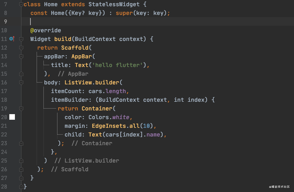 然后回到main.dart文件新建一个Home类,用来存放我们ListView相关代码,和Xcode一样Android Studio同样有代码块功能,直接输入stl就会出现提示,回车就会生成StatelessWidget类相关代码。我们将Scaffold相关的代码挪到Home中来。