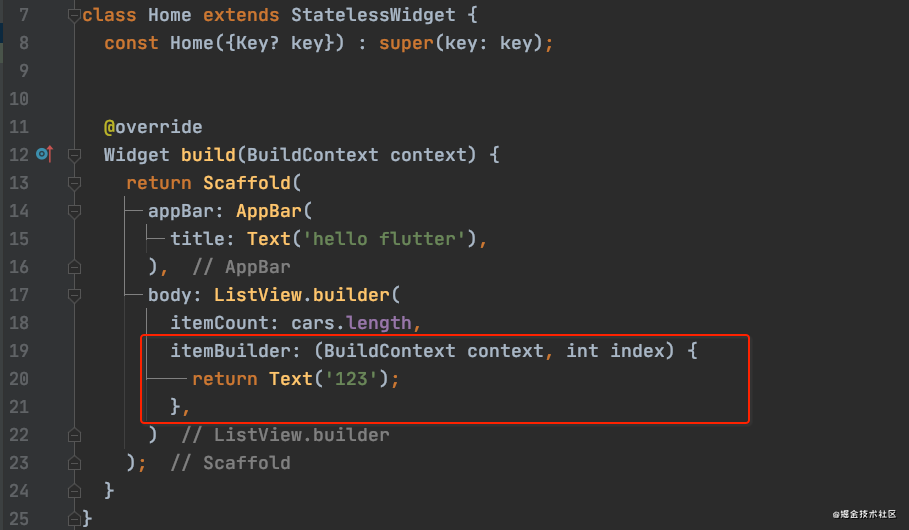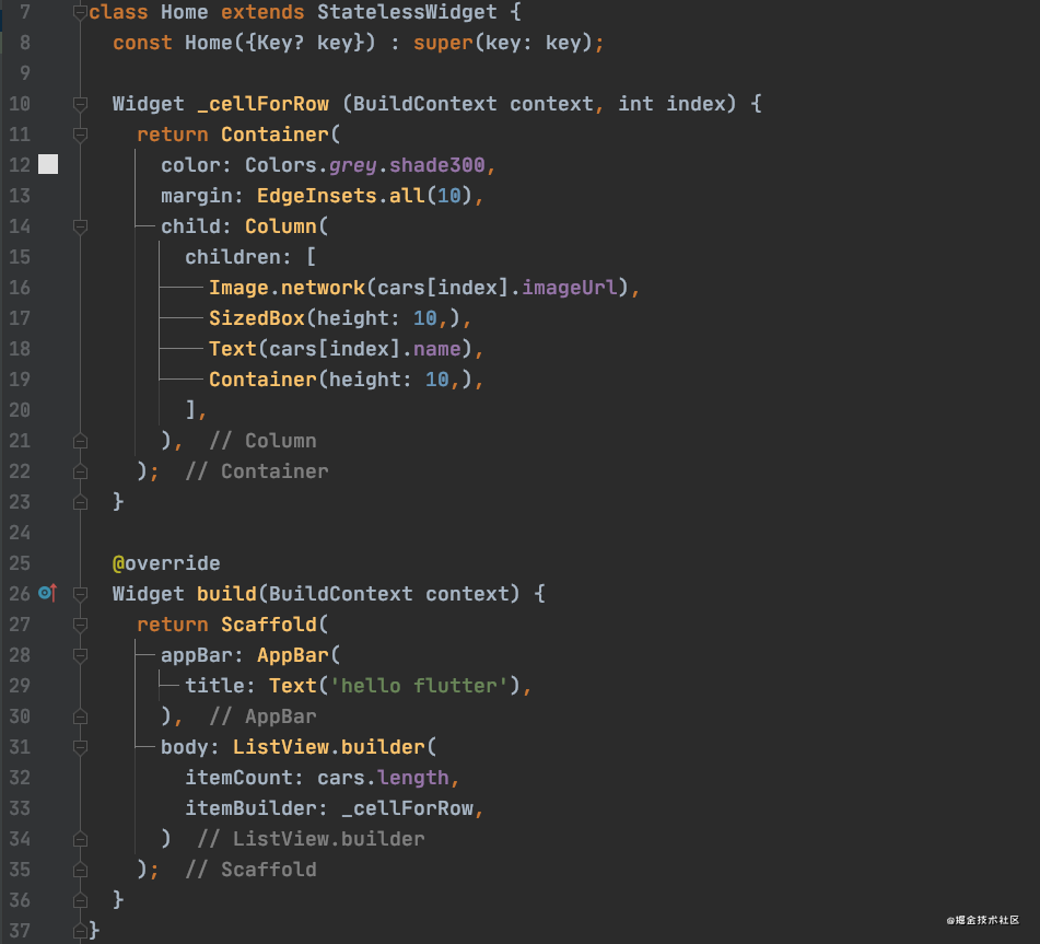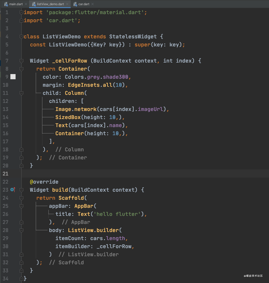 如果觉得itemBuilder的代码太长,也可以将它的代码封装到一个方法里面,例如我这里使用iOS中的_cellForRow来命名这个方法。使用下划线的意义的是表示这是一个私有方法。