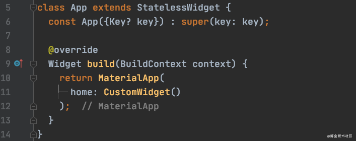 flutter里面的Widget类叫作小部件,是flutter里面经常用到的,它分为有状态的Stateful和Stateless无状态的。其中无状态的比较简单,我们先自定义一个类CustomWidget继承自StatelessWidget。我们自定义的Widget想要显示到屏幕上需要实现一个build的函数,系统会调用这个函数来渲染我们想要显示到屏幕上的内容