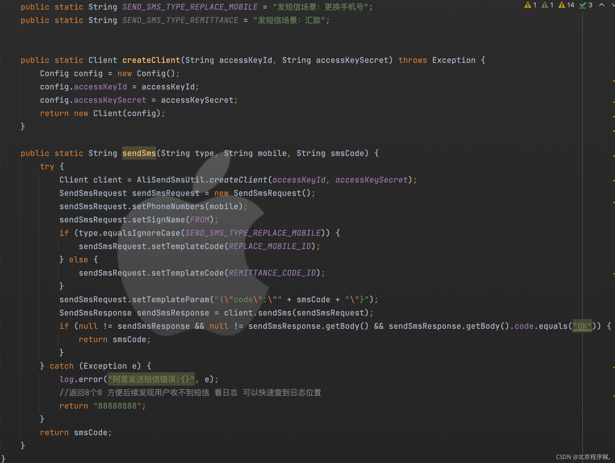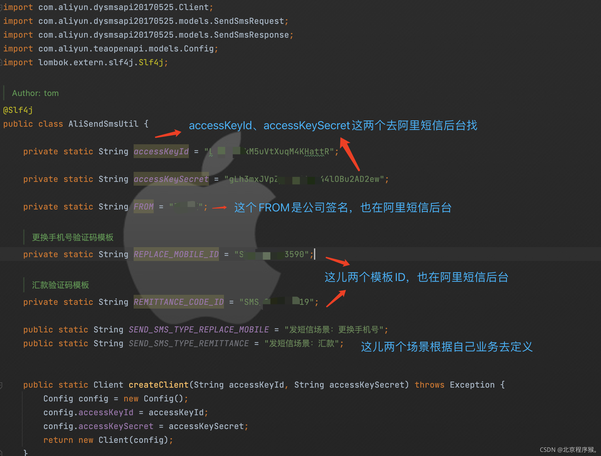 该博客介绍了如何在Java中使用阿里云SDK发送短信验证码。首先,添加了阿里云的pom依赖,然后创建了一个工具类`AliSendSmsUtil`,包括静态变量如access key、短信模板ID等。`sendSms`方法根据指定的场景(更换手机号或汇款验证)发送相应的短信,并处理可能的异常情况。