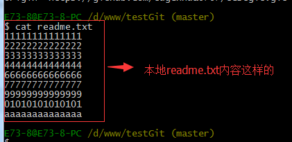 比如我现在在readme.txt文件里面增加一行 内容为555555555555,我们先通过命令查看如下: