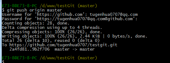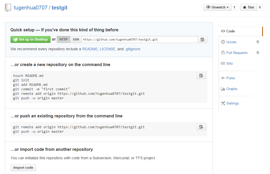 现在,我们根据GitHub的提示,在本地的testgit仓库下运行命令: