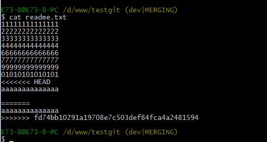 Git用<<<<<<<,=======,>>>>>>>标记出不同分支的内容,其中<<<HEAD是指主分支修改的内容,>>>>>fenzhi1 是指fenzhi1上修改的内容,我们可以修改下如下后保存: