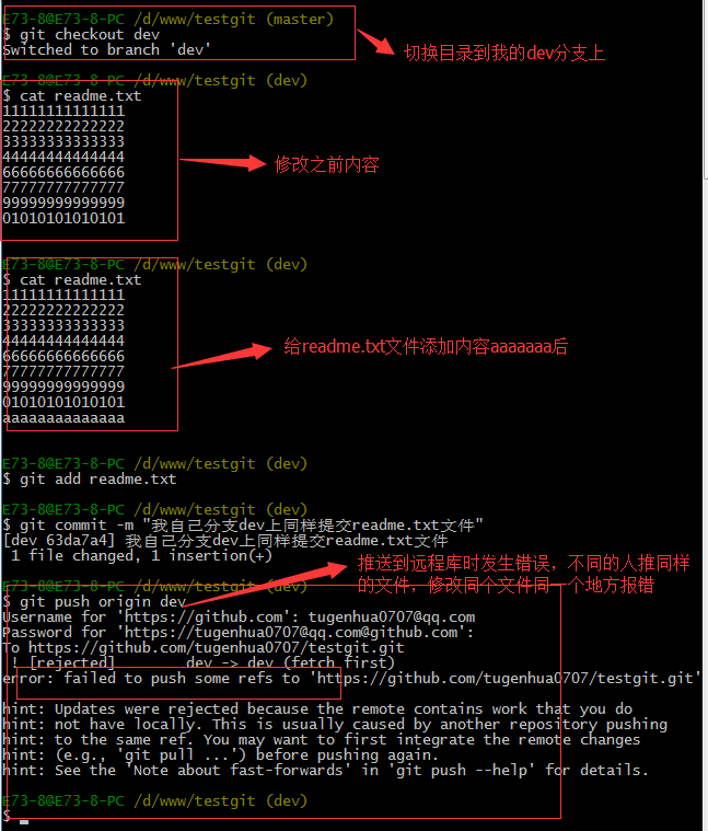 小伙伴们已经向origin/dev分支上推送了提交,而我在我的目录文件下也对同样的文件同个地方作了修改,也试图推送到远程库时,如下: