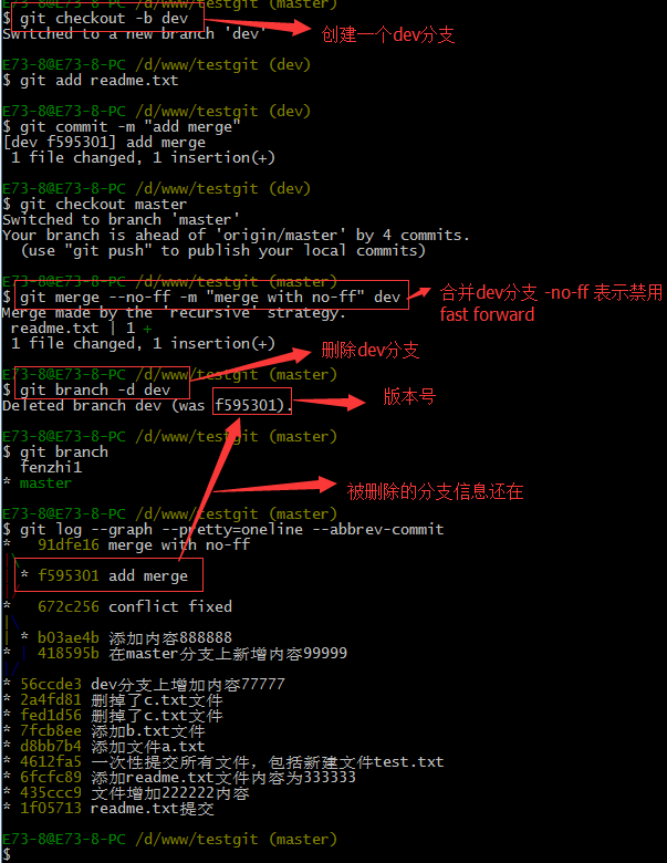 - 合并dev分支,使用命令 git merge –no-ff -m “注释” dev