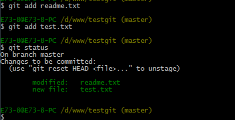 现在我们先使用git add 命令把2个文件都添加到暂存区中,再使用git status来查看下状态,如下: