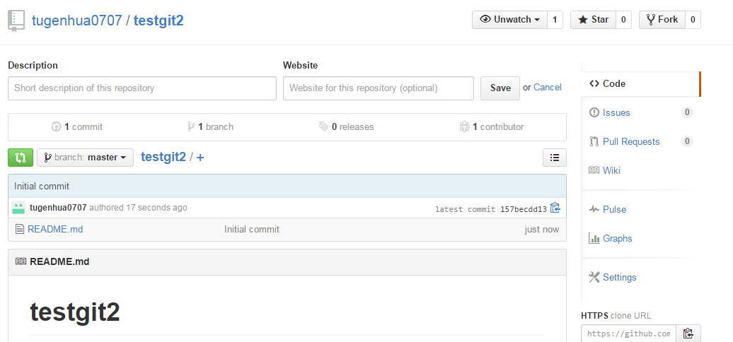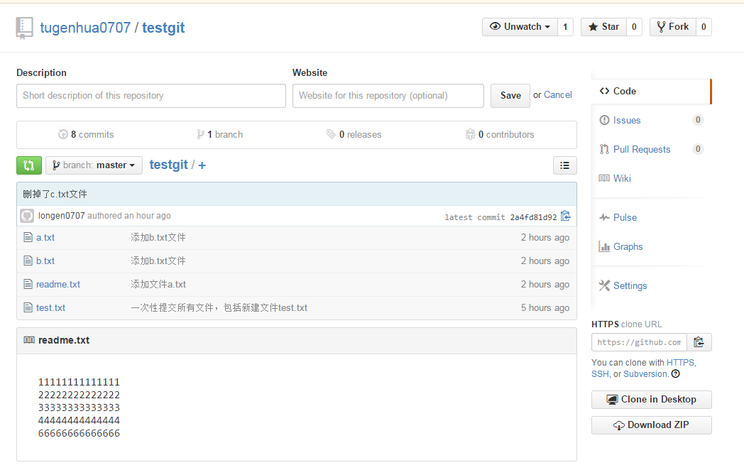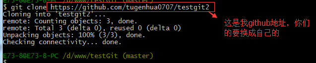 git clone https://github.com/tugenhua0707/testgit 从远程库中克隆