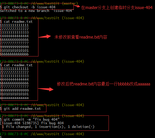 修复完成后,切换到master分支上,并完成合并,最后删除issue-404分支。演示如下: