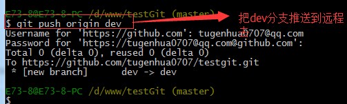 可以看到 推送成功了,如果我们现在要推送到其他分支,比如dev分支上,我们还是那个命令 git push origin dev