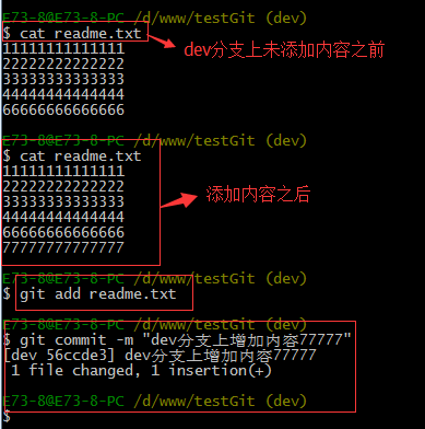下面我们还是一步一步来,先新建一个新分支,比如名字叫fenzhi1,在readme.txt添加一行内容8888888,然后提交,如下所示: