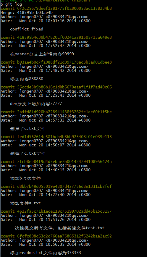 现在我已经对readme.txt文件做了三次修改了,那么我现在想查看下历史记录,如何查呢?我们现在可以使用命令 git log 演示如下所示: