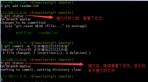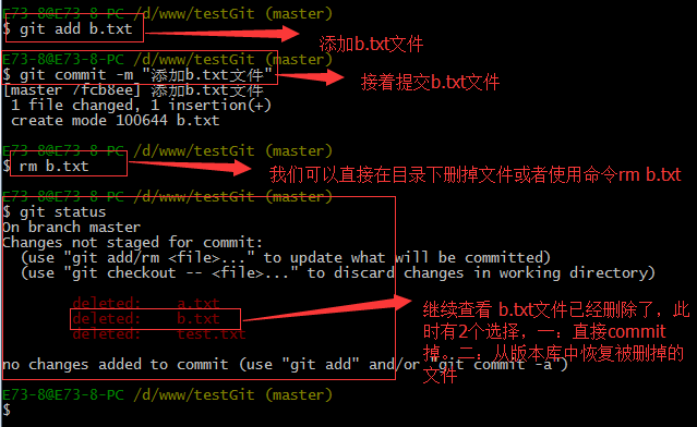 假如我现在版本库testgit目录添加一个文件b.txt,然后提交。如下: