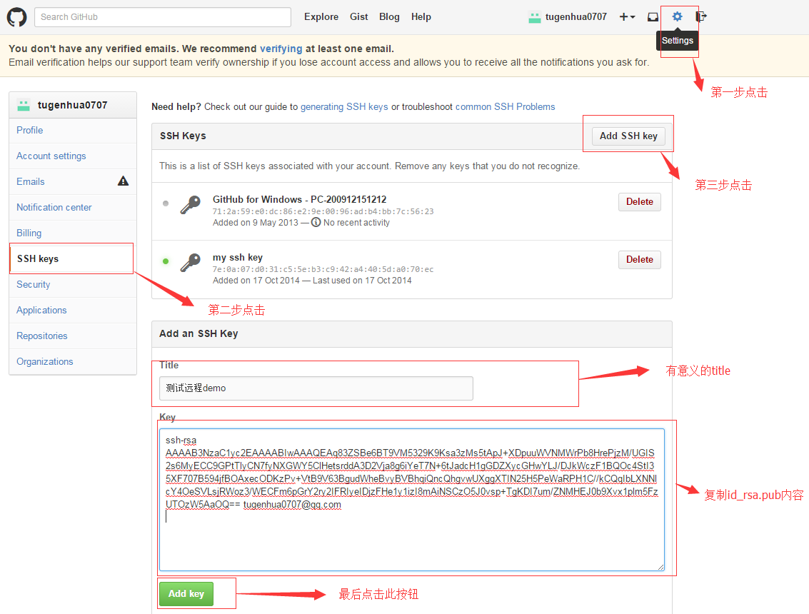 第二步:登录github,打开” settings”中的SSH Keys页面,然后点击“Add SSH Key”,填上任意title,在Key文本框里黏贴id_rsa.pub文件的内容。
