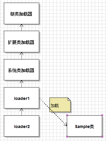 如果Sample类还没有被加载,loader2首先请求loader1代为加载,loader1再请求系统类加载器代为加载,系统类加载器再请求扩展类加载器代为加载,扩展类加载器再请求根类加载器代为加载。