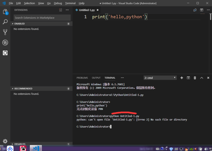 2、输入python加上文件代码的路径,若不想使用绝对路径则需要运行的文件在当前路径内,可通过在命令行中的操作改变当前路径。在进入e和c盘时只需输入e:或c:,但在进入d盘时需要输入cd/dd:。