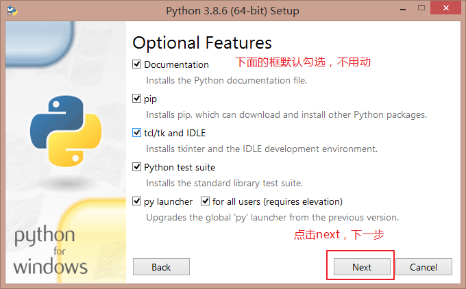 进入自定义安装界面,如下图所示。图中的勾选框默认勾选,不用动。点击next,下一步。