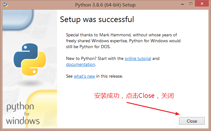 等待几分钟之后,出现下面的界面显示安装成功,点击Close,关闭该页面即可。