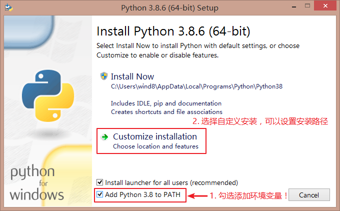 下载好Python的安装包之后,双击打开安装包,启动安装程序,出现下图的界面。这里需要做两步。