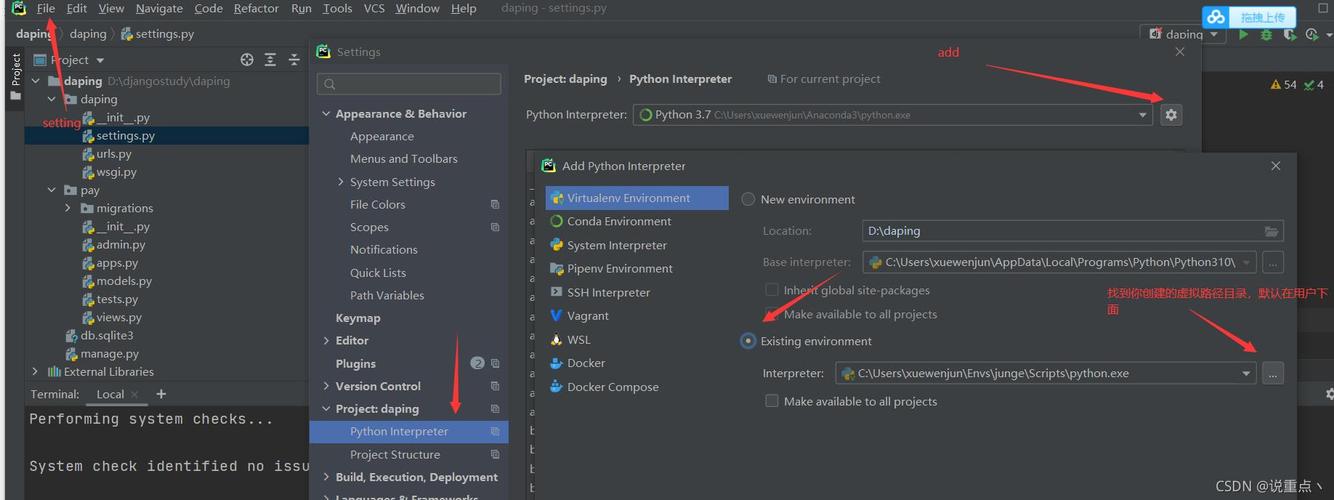 栏的 File按钮—》点击Settings—》在弹出的 Settings 对话框左侧栏点击 Project 下的 Project Interpreter—》点击右上角齿轮按钮—》点击System Interpreter—》点击右上角 ...按钮,找到你安装的 Python 解释器目录选中 python.exe,然后一路点击 OK 按钮。