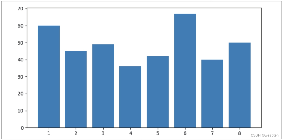 第1行代码导入Matplotlib模块的子模块pyplot,第2行和第3行代码分别给出图表的x轴和y轴的值,第4行代码使用bar()函数绘制柱形图,第5行代码使用show()函数显示绘制的图表。