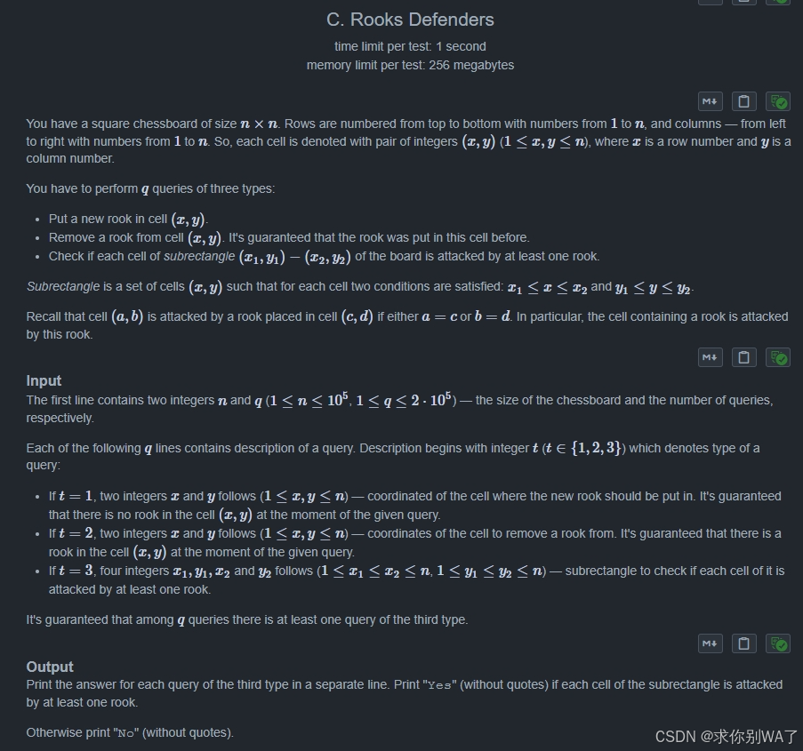 题目大意 :每次放一辆车 可以对当前行 和 当前列造成伤害 每次查询一个矩形 判断矩形里面是否全部受到伤害