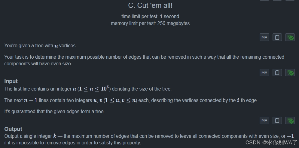 if(s % 2 == 0) ans ++;//如果以u为根的节点数量为偶数ans++