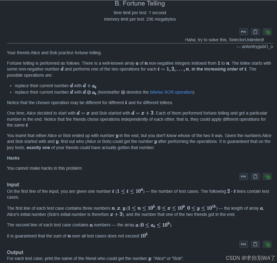 题目大意:给定初始值 x,a[i] A从x开始 B从x+3开始 每次可以对a[i]进行加法或者异或(0<i<n)
