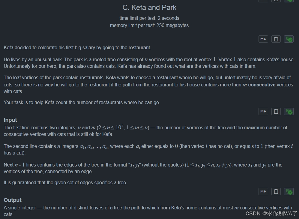 题目大意:从家走到餐厅需要路过公园 kefa选择性恐猫症(不能连续遇到m只猫猫)餐厅在叶子节点,求到餐厅的个数