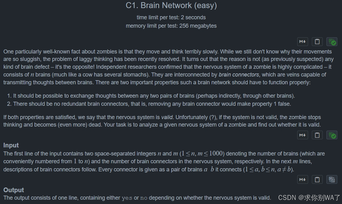 题目大意:一副无向图 判断图中所有点是否能到并且不存在环(也就是多余边)