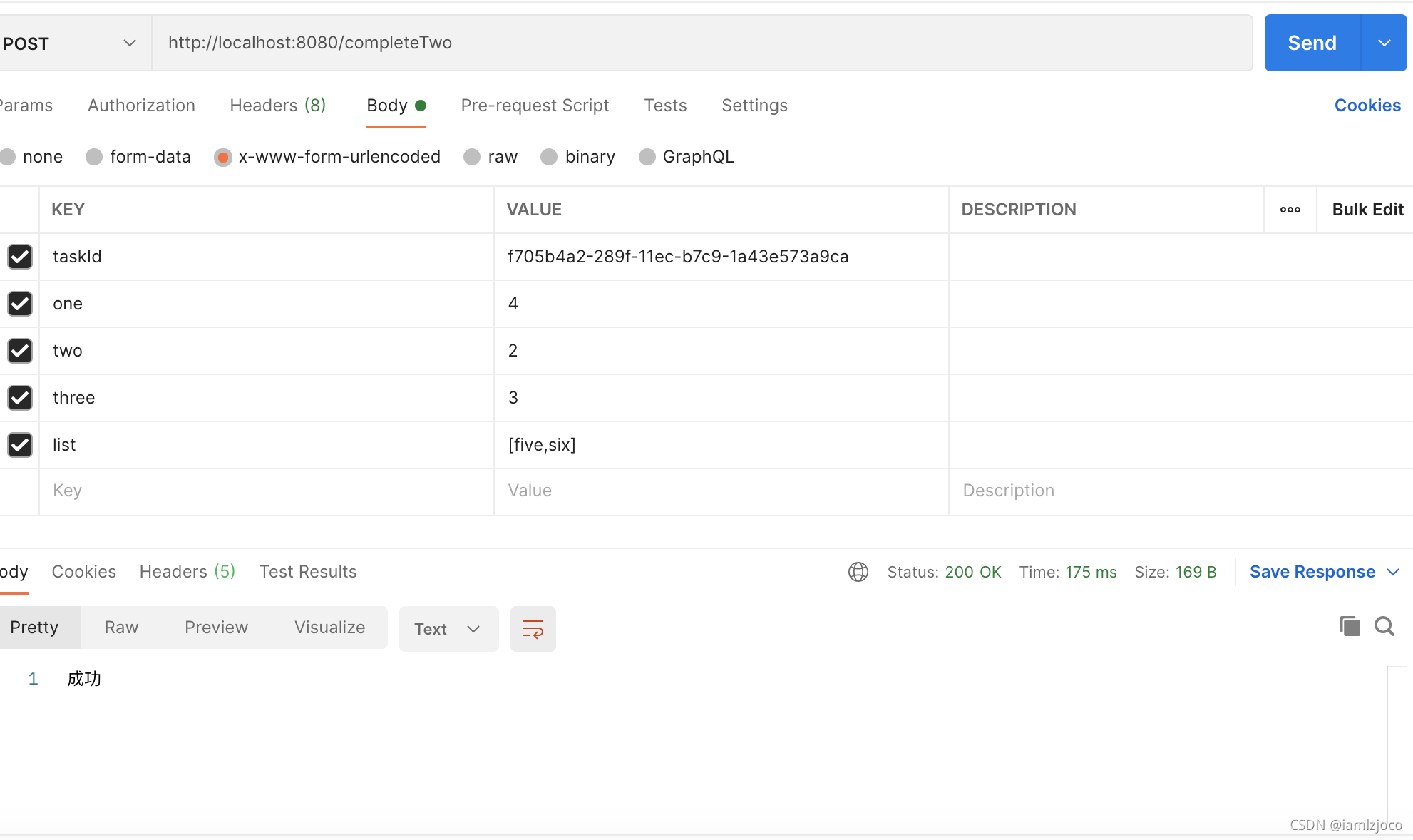 public String completeTwo(String taskId, Integer one, Integer two, Integer three,@RequestParam(value = "list" ,required=false) List<String> list) {