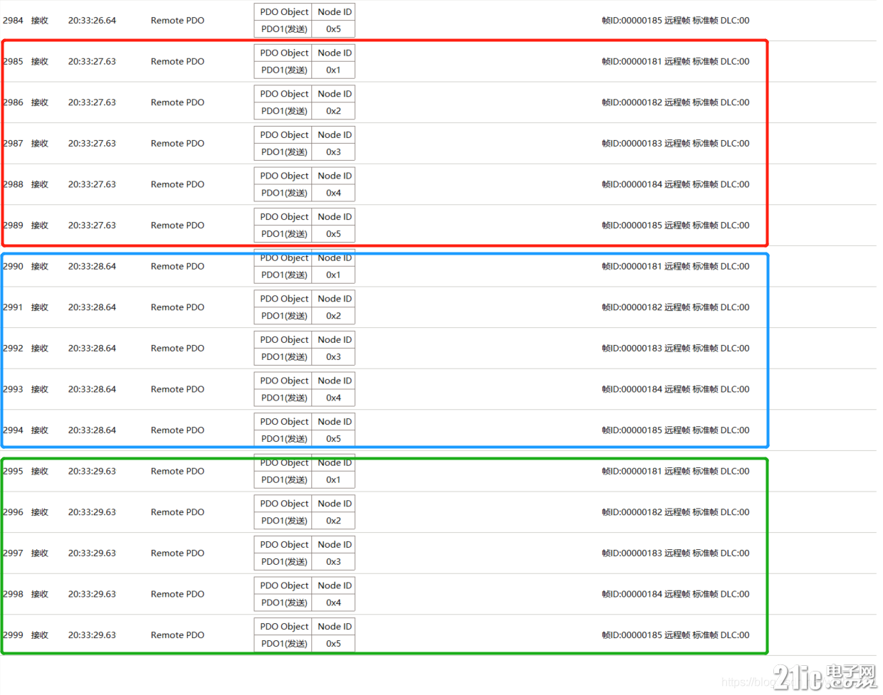 从上图可以看到,CAN分析仪每隔1S时间,收到CAN_ID为0x181,0x182,0x183,0x184,0x185的5条CAN报文。