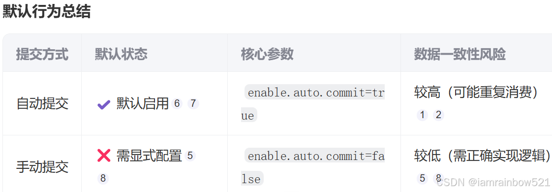 - 缺点:可能导致消息重复消费(如提交偏移量后,消费者尚未处理完消息时发生故障或再均衡)。