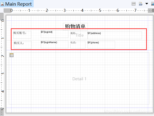 4.将抬头字段拖到到报表模板里的TITLE位置,并拖动子报表元素到detail里。